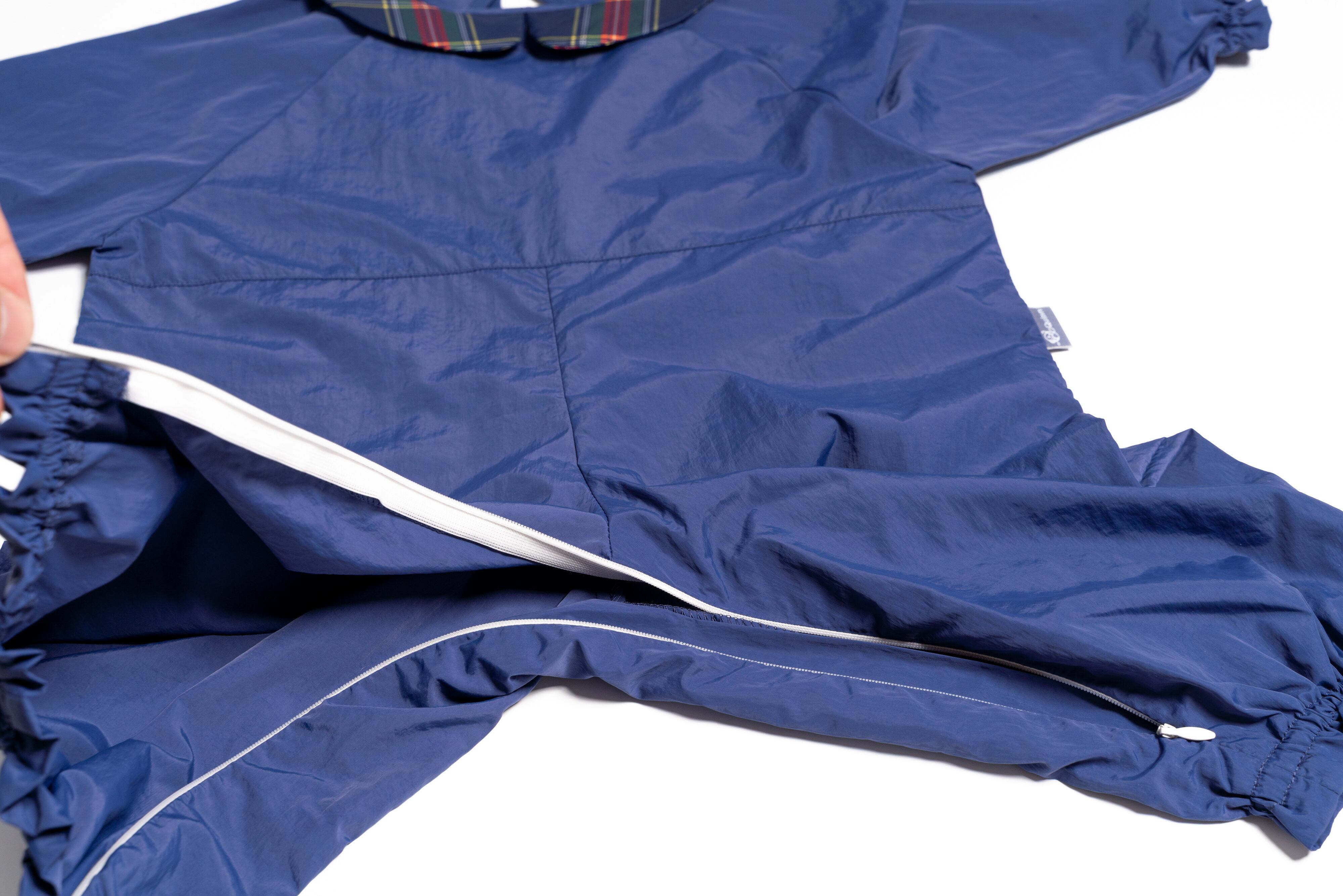 着脱しやすいように背中部分は大きく開き、またオムツ替えがしやすいように股の部分は片側ジッパー仕様となっております。